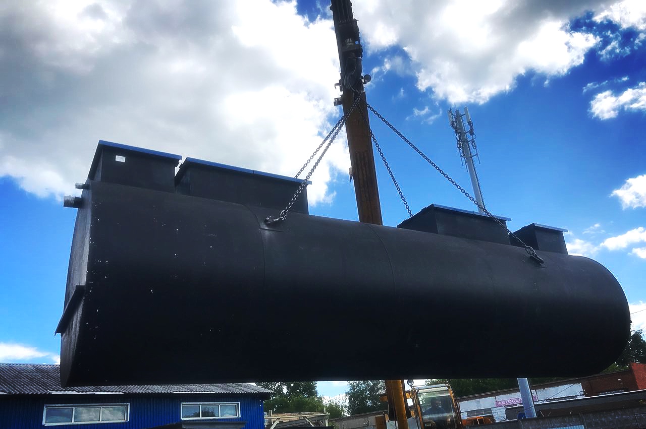 Габариты очистного сооружения: 2 емкости длиной 8400 / диаметром 2400 / весом 9800 кг.